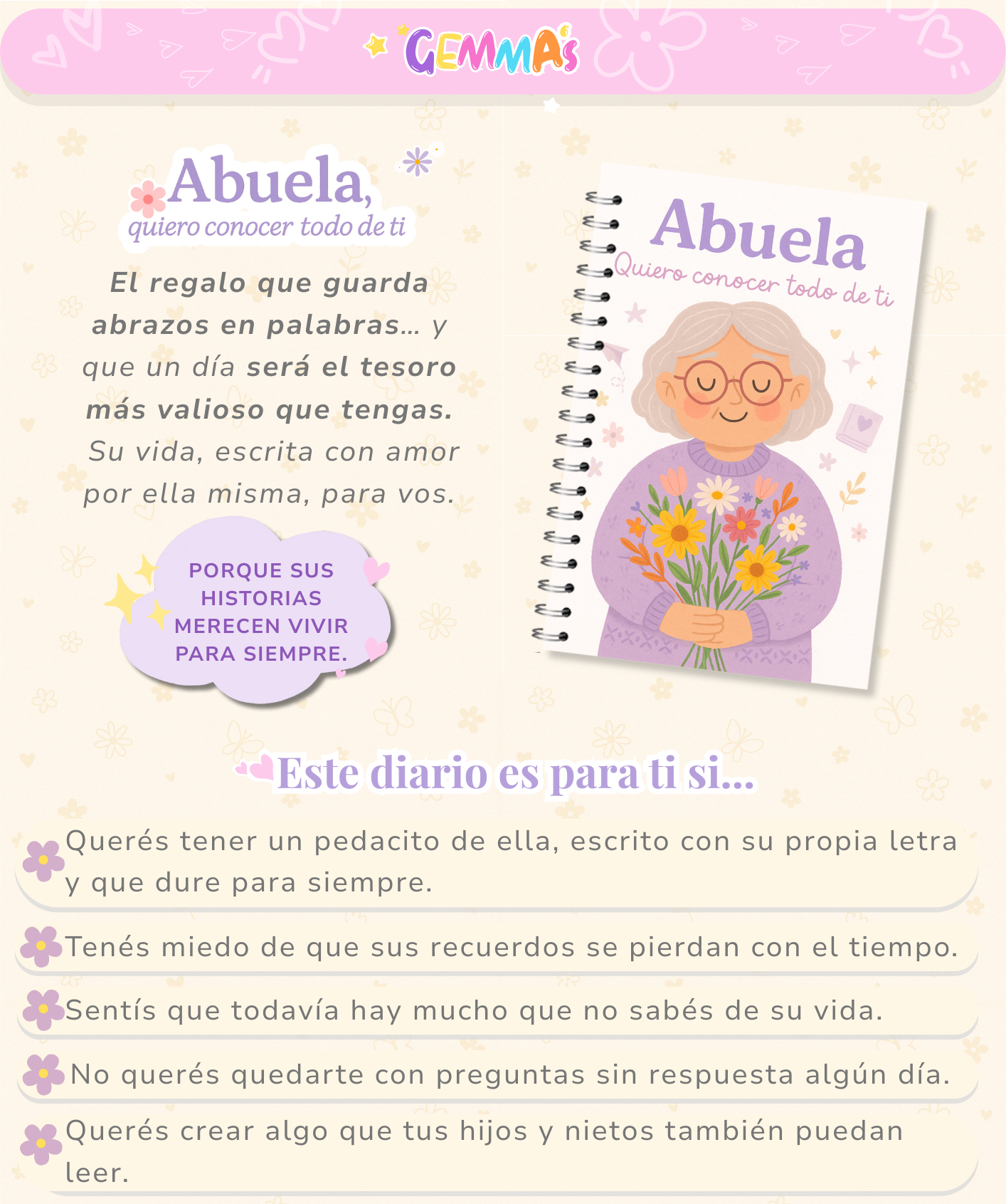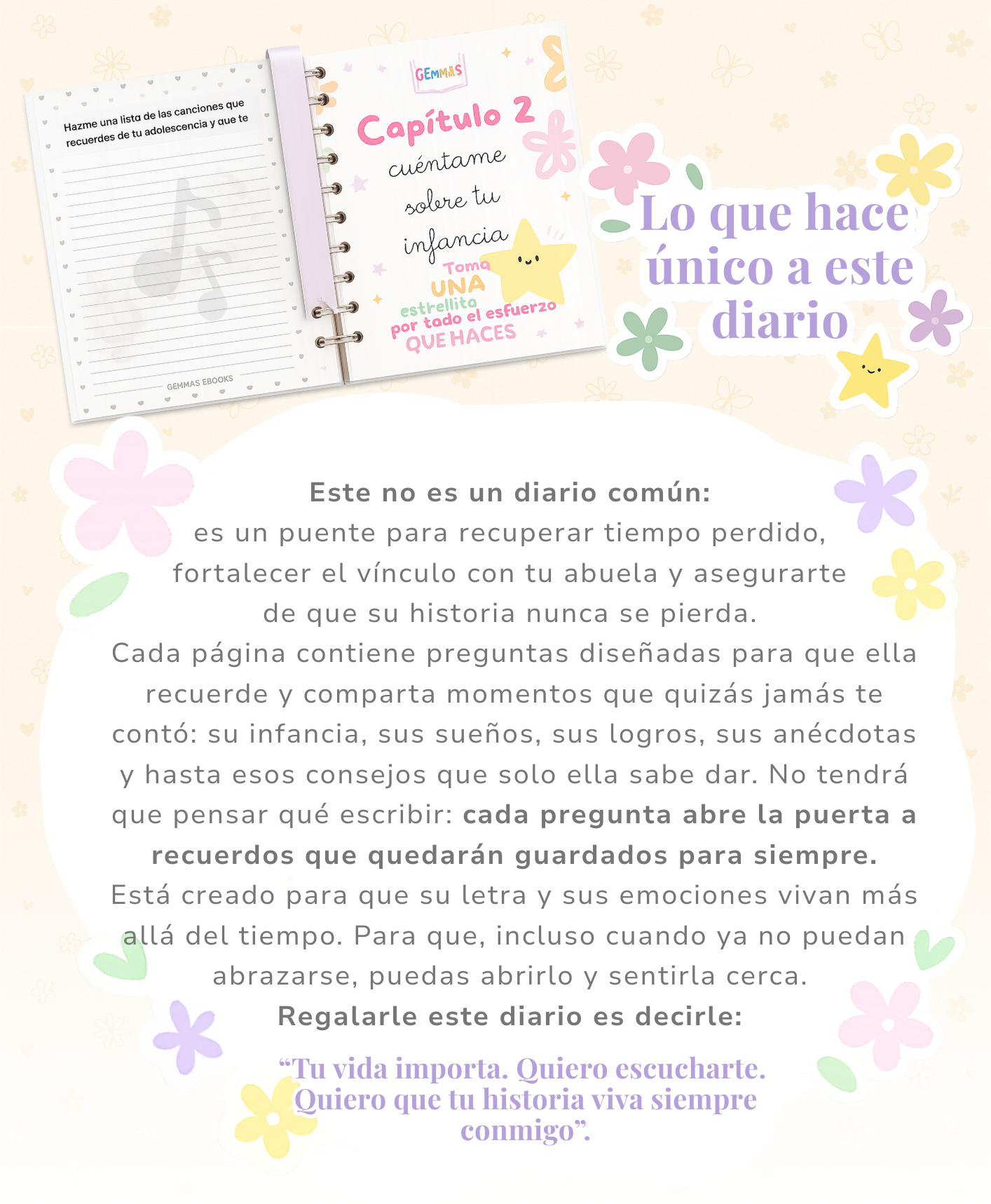 Incluye preguntas cuidadosamente diseñadas para guiarlo en un recorrido por su infancia, juventud, familia, trabajo, sueños y momentos más especiales.